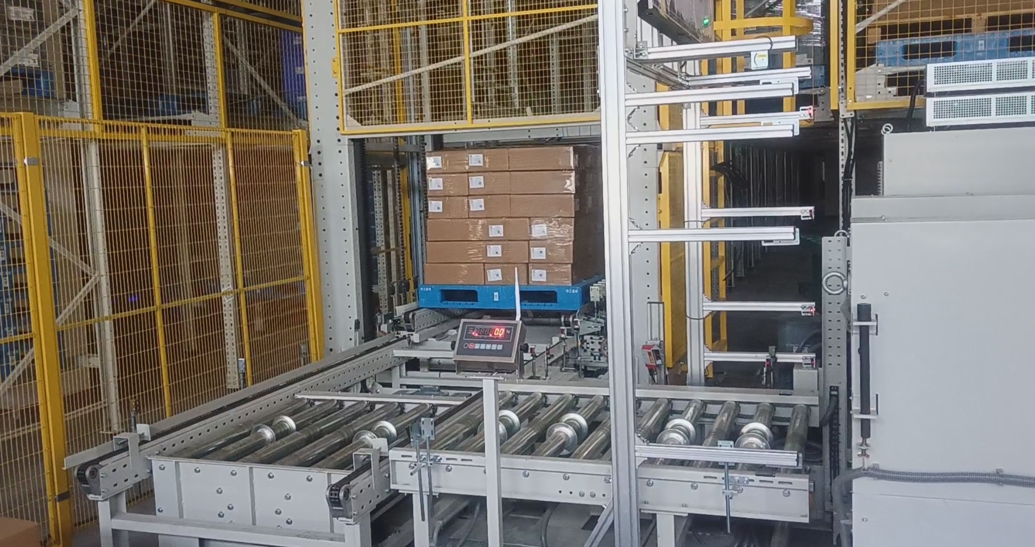 Pallet transfer conveyor is mainly to complete the merging of goods from the main line to subline, through the right-angle transfer, cooperate control procedures, can effectively complete the box on the mainline right-angle turn or from the main line into the subline.